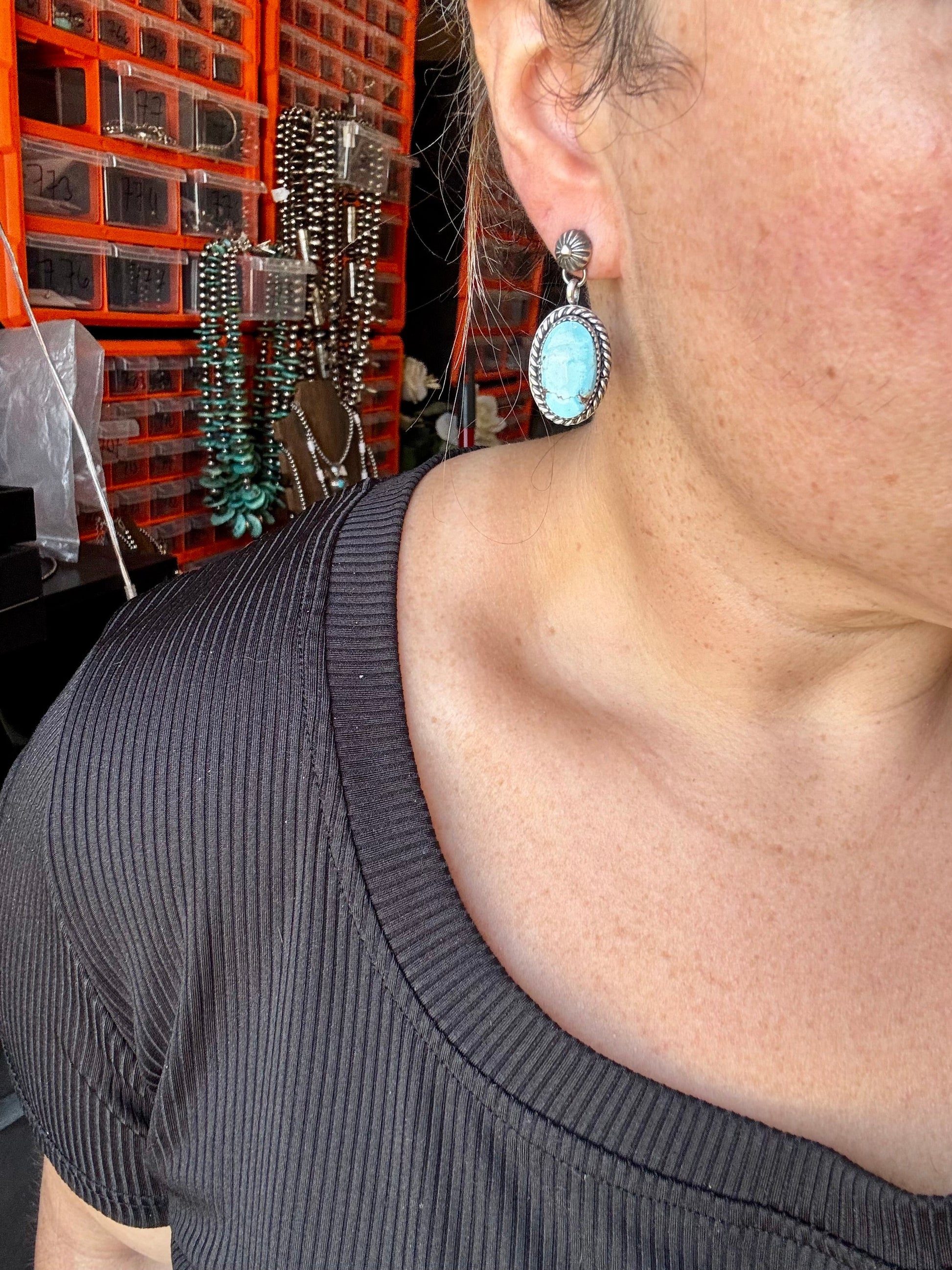 A stunning pair of Golden Hill turquoise earrings with soft lavender-blue tones and natural matrix — set in sterling silver with a post-back dangle design. Handmade in the USA, these are a rare find with a color that turns heads. Lightweight, elegant, and full of character.