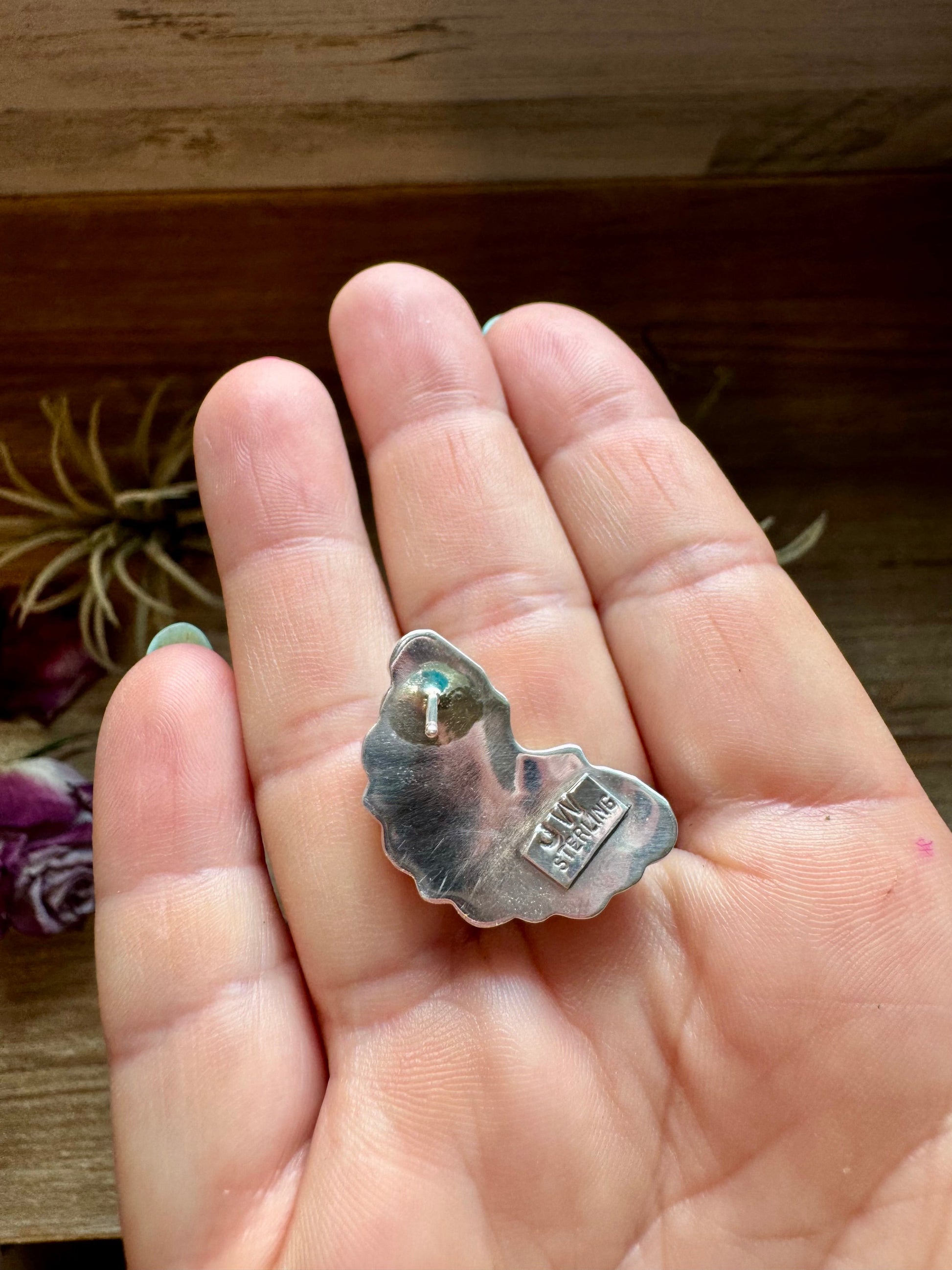 Handmade in the USA, these bold turquoise cluster earrings feature genuine Kingman turquoise with a rustic, natural look that makes each pair truly unique. Crafted in sterling silver and stamped “JW” for authenticity, they are designed with a stud post on top for secure wear. With two pairs available, each carries its own one-of-a-kind variation in turquoise color and matrix.