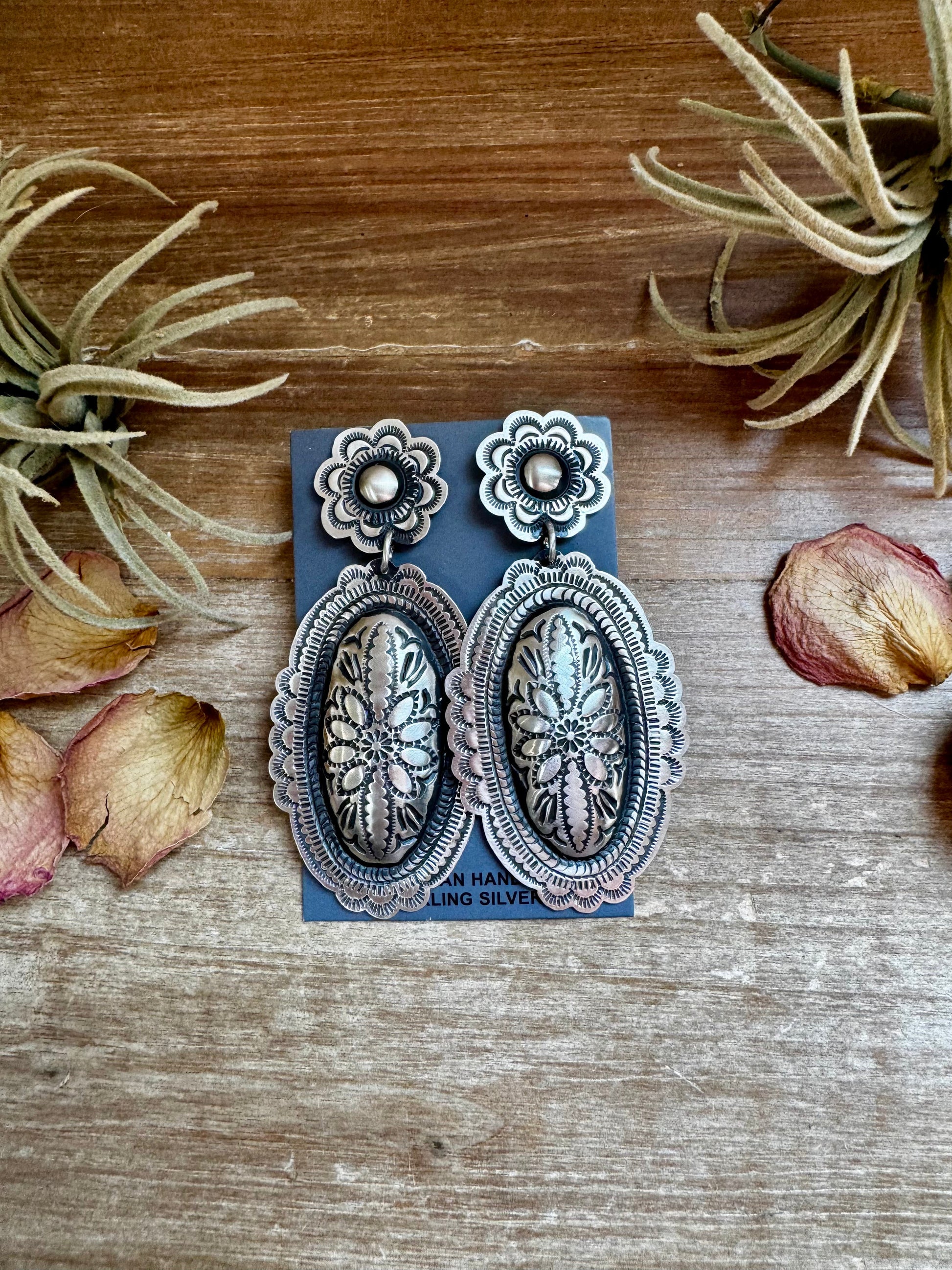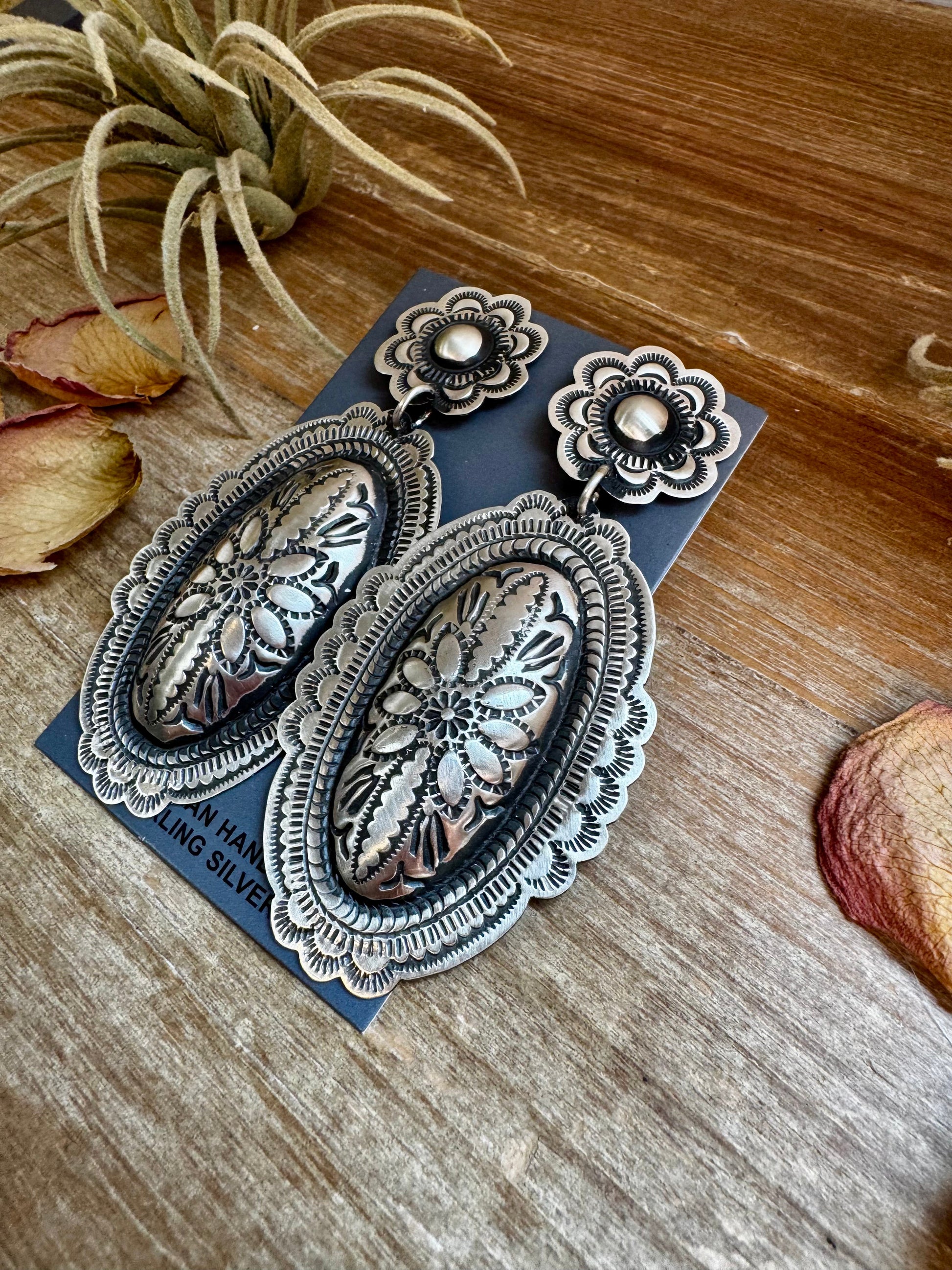 These bold sterling silver earrings by Leander Tahe feature incredible hand-stamped designs with a post top and dangle bottom. A true statement piece that showcases traditional craftsmanship in a powerful, wearable way.