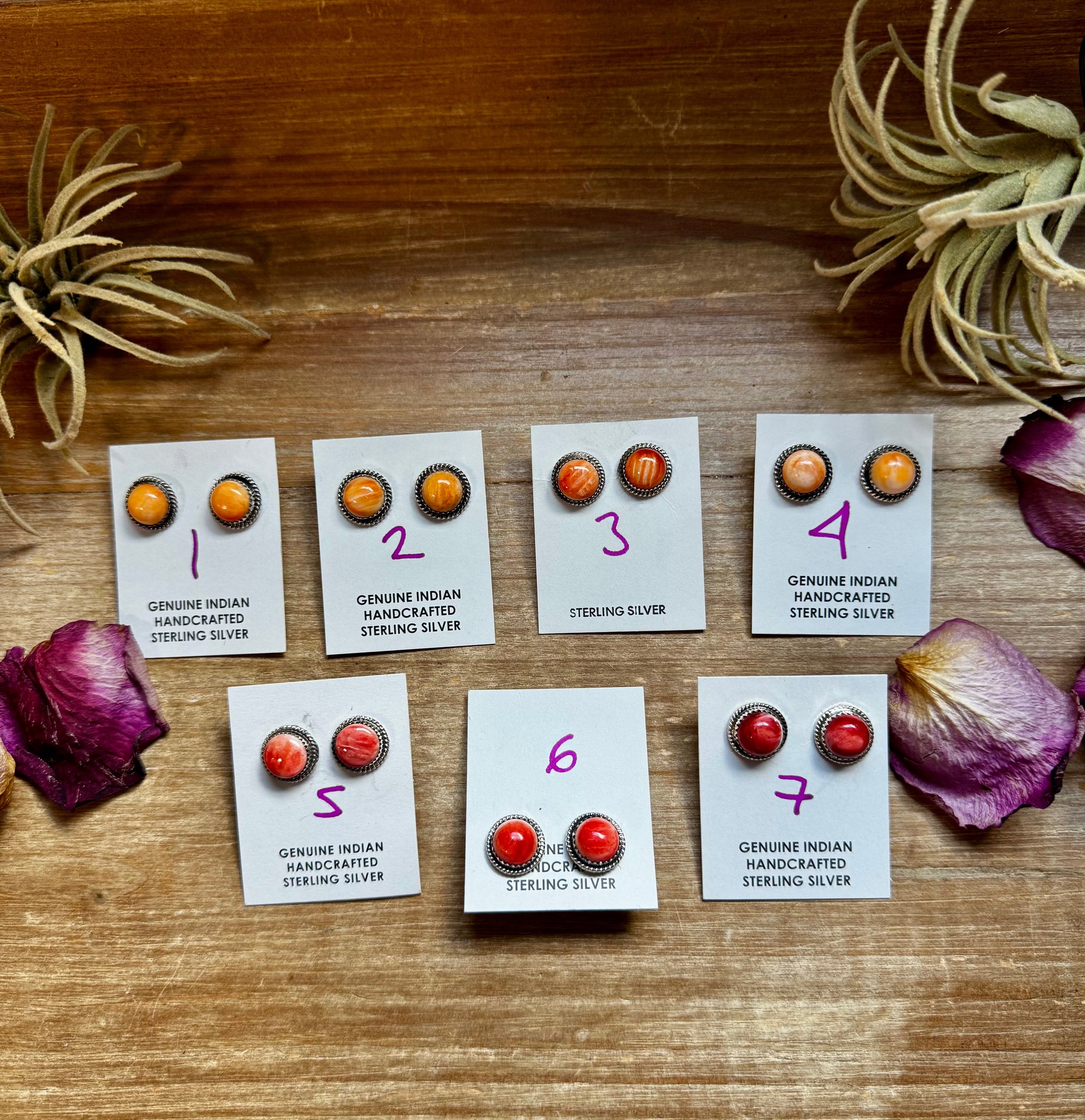 These spiny oyster stud earrings are set in sterling silver and feature beautiful natural color variations in rich shades of orange and red.
