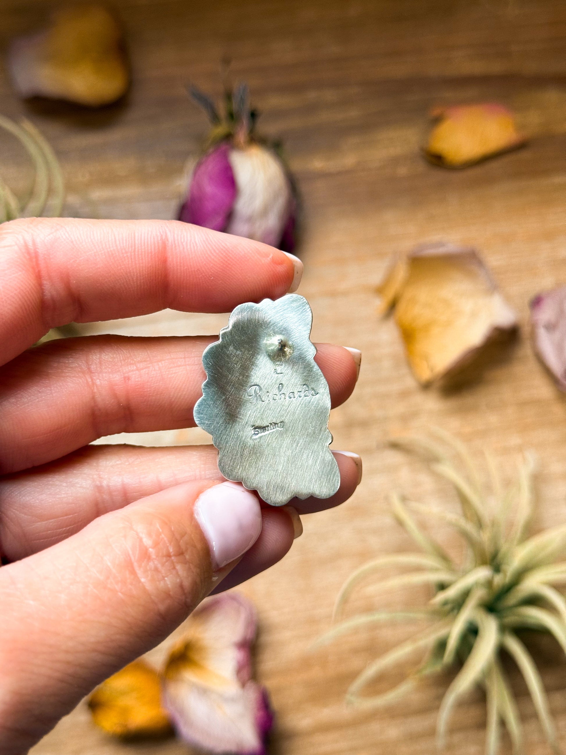 These bold half-cluster earrings feature genuine Kingman turquoise stones hand-set in sterling silver. Native made by Navajo artist E. Richards, each pair is beautifully crafted with a stud-on-top design for secure and comfortable wear. The larger statement size highlights the vibrant turquoise blues and natural matrix — no two pairs are ever identical. A stunning example of authentic Navajo silversmithing and a must-have for turquoise collectors.